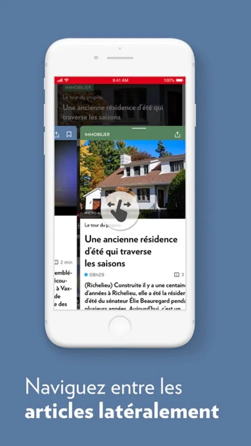 - La navigation permet de défiler les nouvelles les plus récentes de haut en bas, puis de faire un balayage de droite à gauche à partir d’un article afin de consulter d’autres contenus;