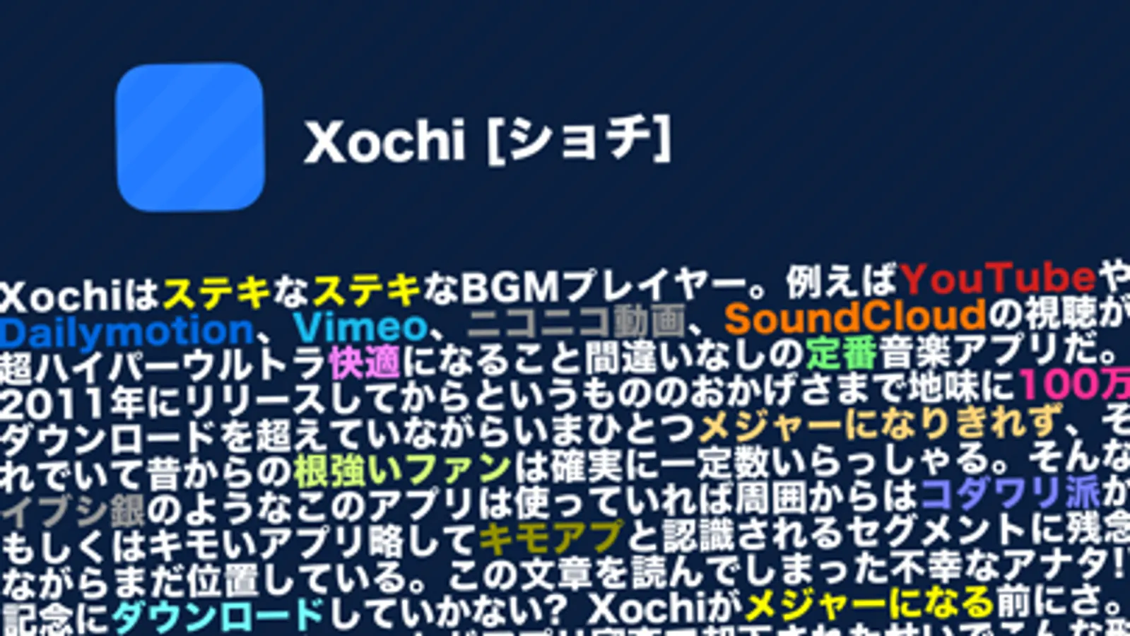 Xochi is the nice YouTube (, Dailymotion, Vimeo, Niconico) BGM player.