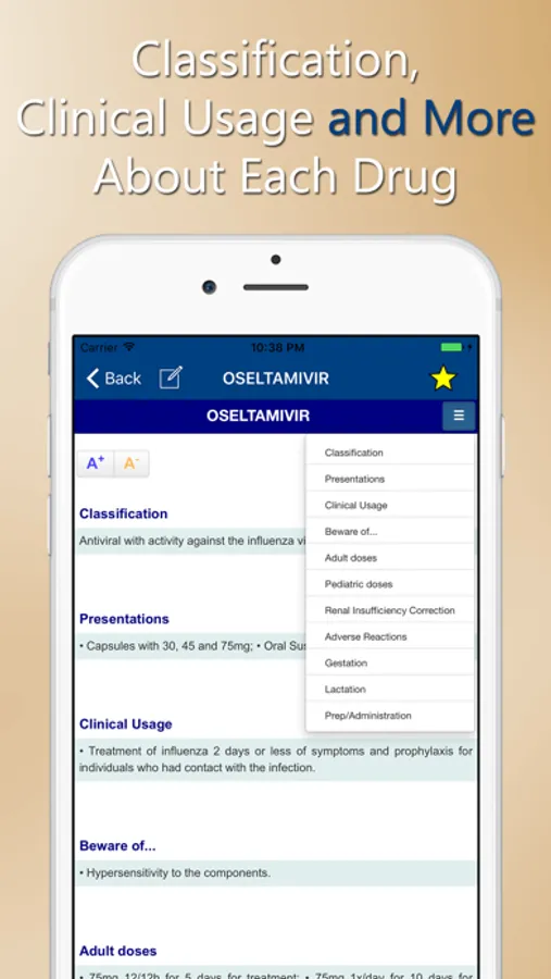 Doses, dilutions, standard solutions, corrections to renal failure, risk in pregnancy and lactation everything easily accessible. Search bars for active ingredients , trade names and clinical indications, dosages for adults and pediatrics..