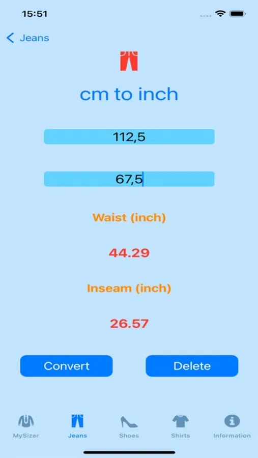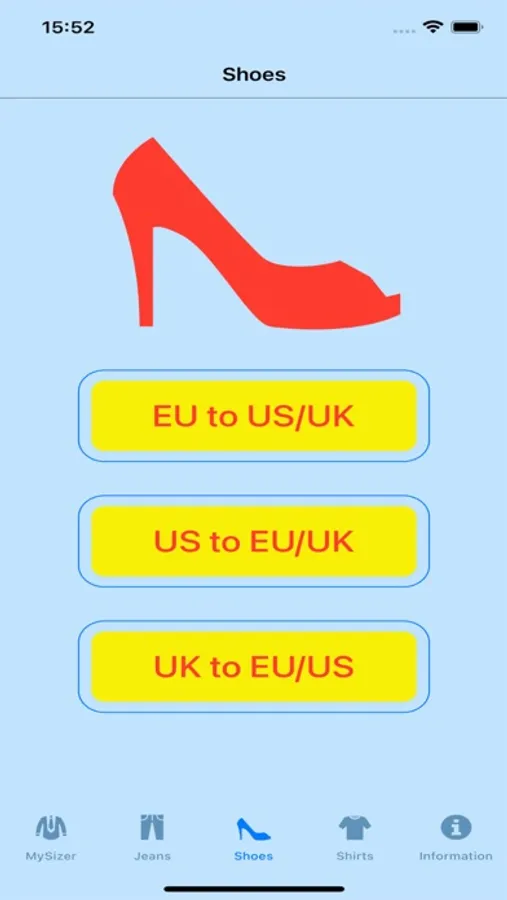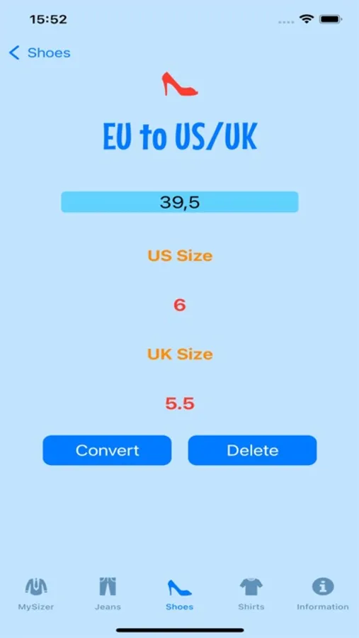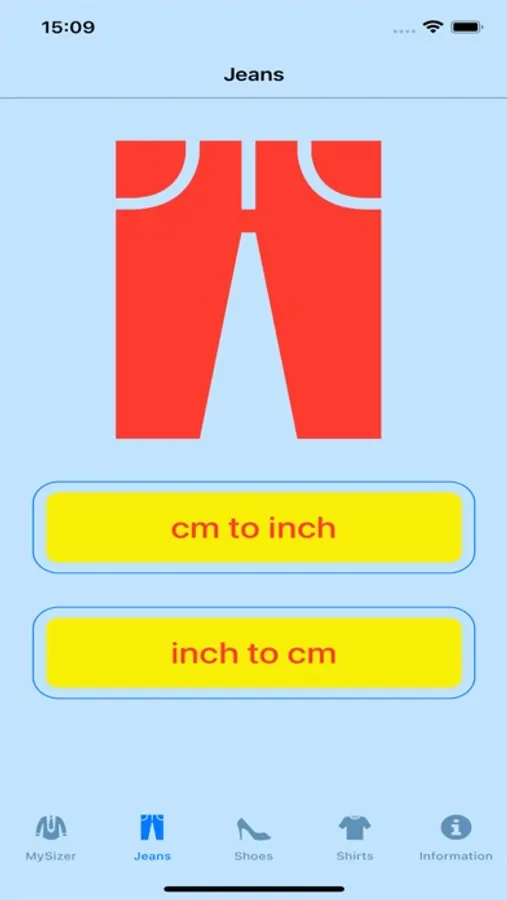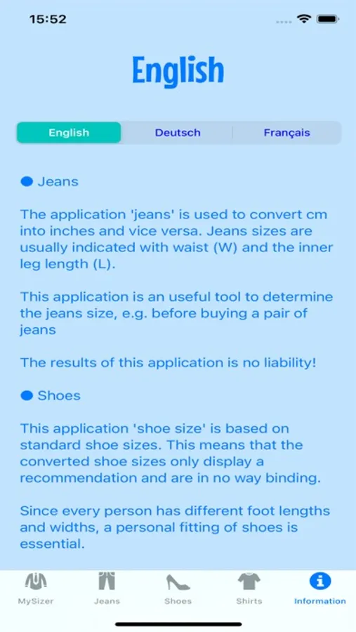 The app „MySizer“ is an easy to use application for conversion of jeans, shoe and shirt sizes. Especially, if you are on a trip abroad and you want to know e.g. the size of a pair of shoes before buying them.