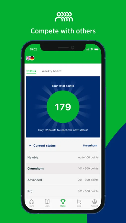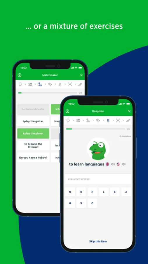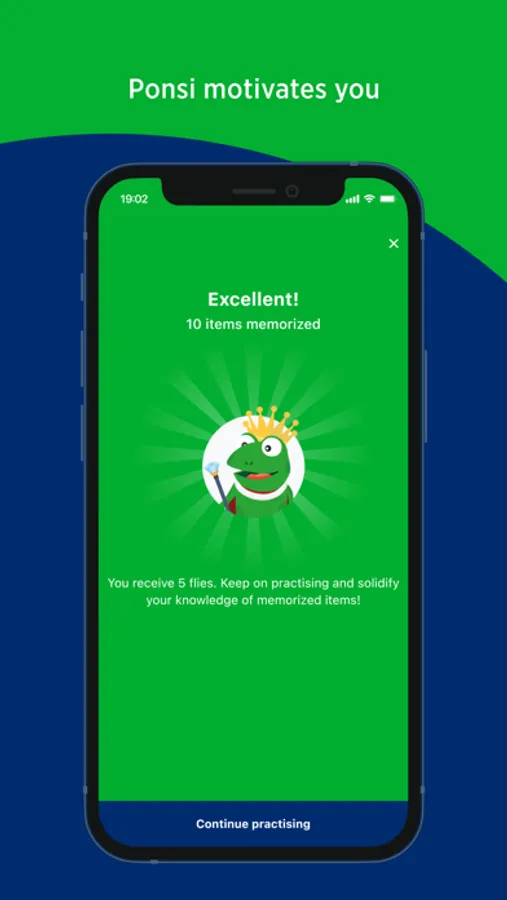 The training is divided into the phases memorising, practising and testing. Various exercises make learning fun, and you will always get feedback and tips from Ponsi, the motivated frog. You can also check your learning statistics to keep track of your performance.
