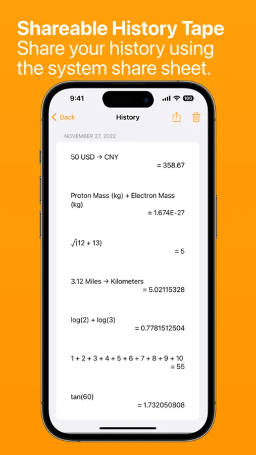 Don’t be selfish. This history tape can be shared either as a single thread or the entire tape using numerous methods such as email, messaging, or print. There is also an iMessage app so you can easily send calculations.