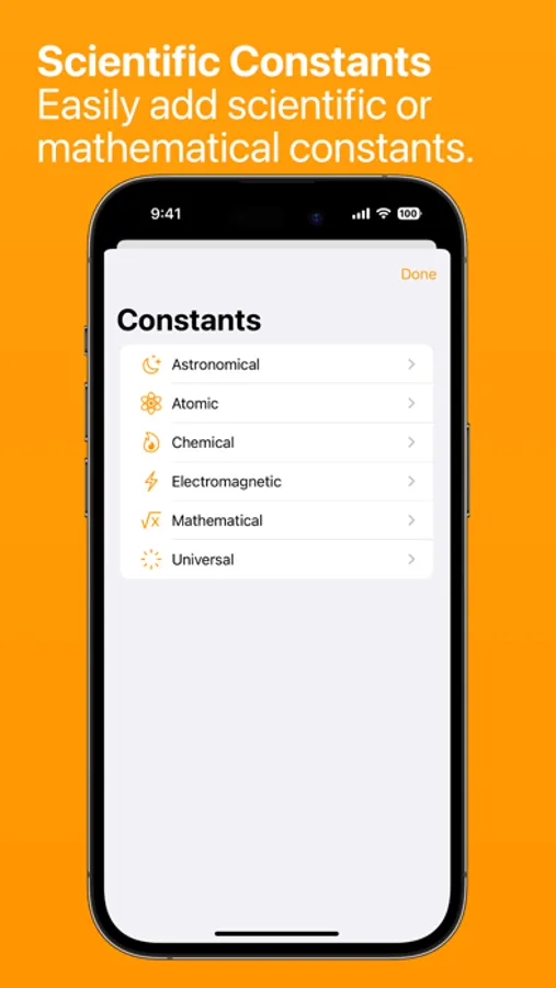 Common constants from both mathematical and scientific fields (astronomical, chemical, electromagnetic, etc.) are included for use in calculations.