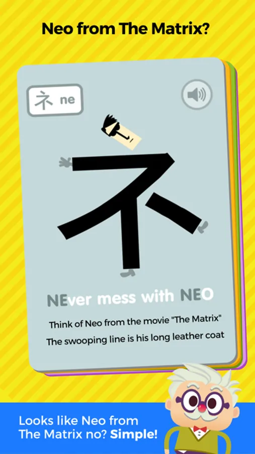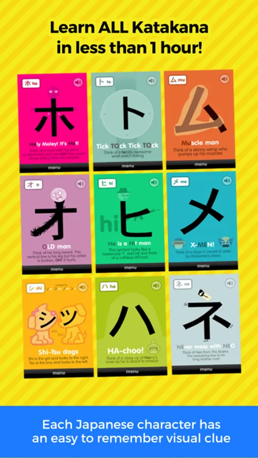 Each screen presents a Katakana character along with a mnemonic clue and audio clip. Read the clue, listen to the clip and move on to the next one. The alternating bold colors will 'reset' your brain so you start fresh with each character. Then take a quiz! You will be amazed at your ability to recall Katakana after just a few minutes.