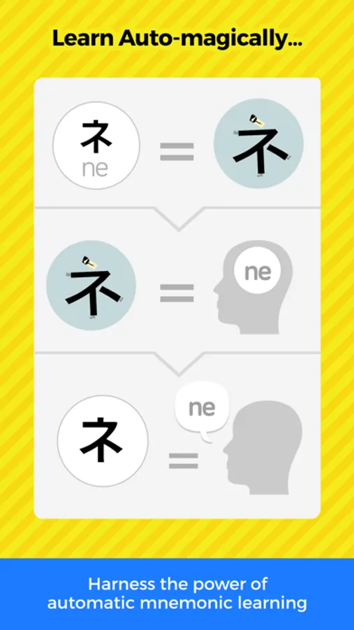 Each screen presents a Katakana character along with a mnemonic clue and audio clip. Read the clue, listen to the clip and move on to the next one. The alternating bold colors will 'reset' your brain so you start fresh with each character. Then take a quiz! You will be amazed at your ability to recall Katakana after just a few minutes.