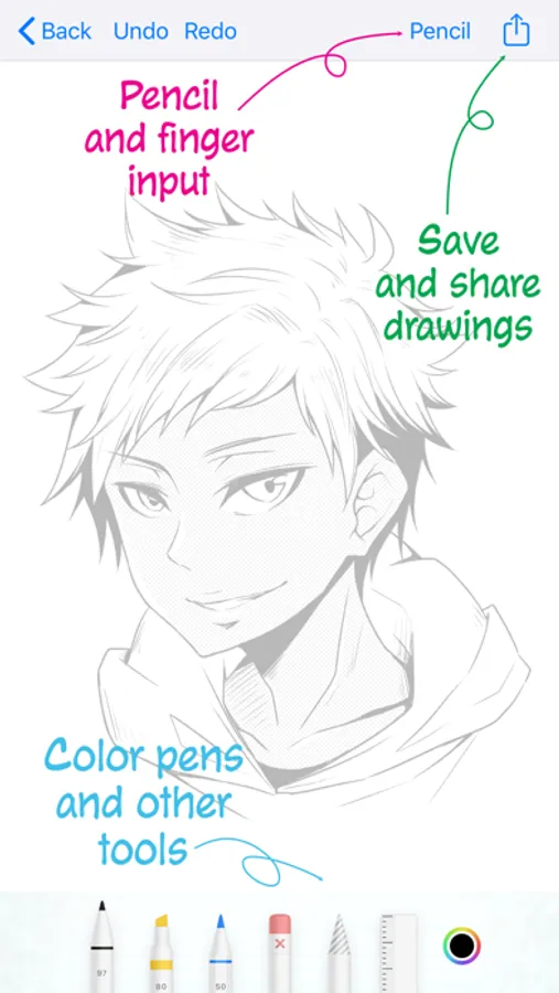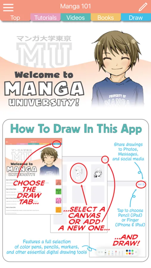 Download Manga University 101 and start drawing! That’s right — you can draw right inside the app, using your finger, an Apple Pencil, or a third-party stylus. Then, share your art by texting or emailing it, or save it to the camera roll.