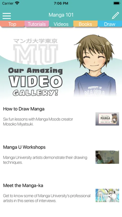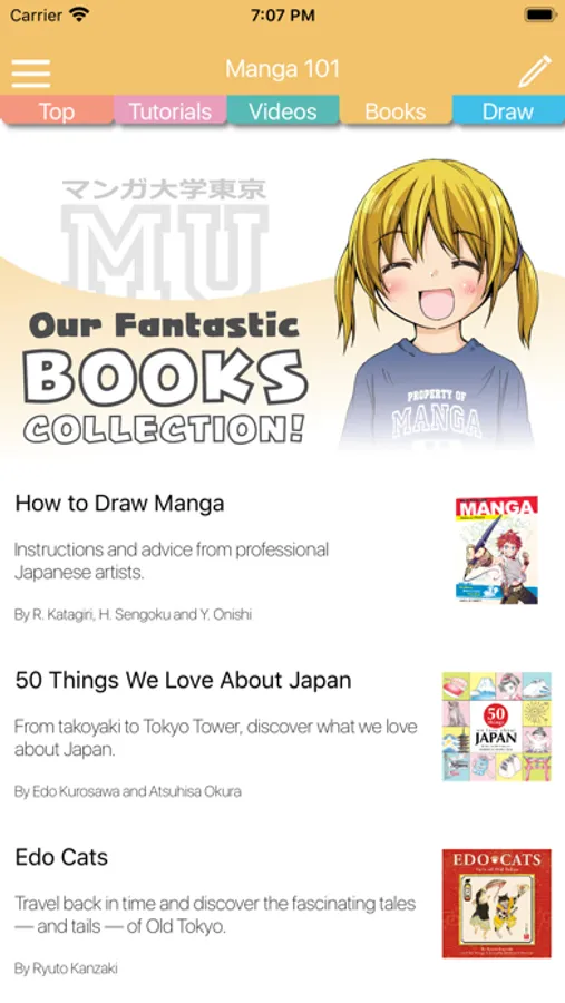 The app also comes with a complete catalog of Manga University books (with links so you can get them on the Apple Books store); our popular gallery of YouTube videos (including the "How to Draw Manga" series featuring Mosoko Miyatsuki); and news and interviews from our Tokyo Campus Blog.