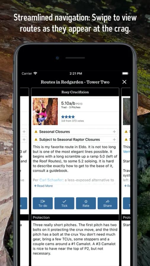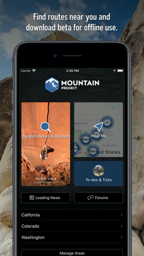 • Download route beta, photos, and topos state by state for offline use — because the best crags often have the worst reception.
