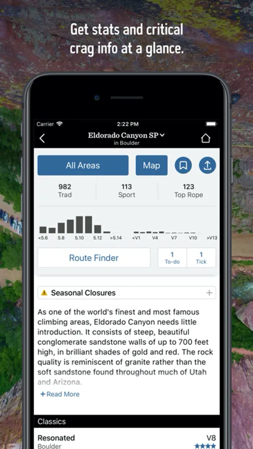 • View a climbing area’s route stats (how many 5.11s are there?) and critical info (when is the raptor closure again?) in a single glance.