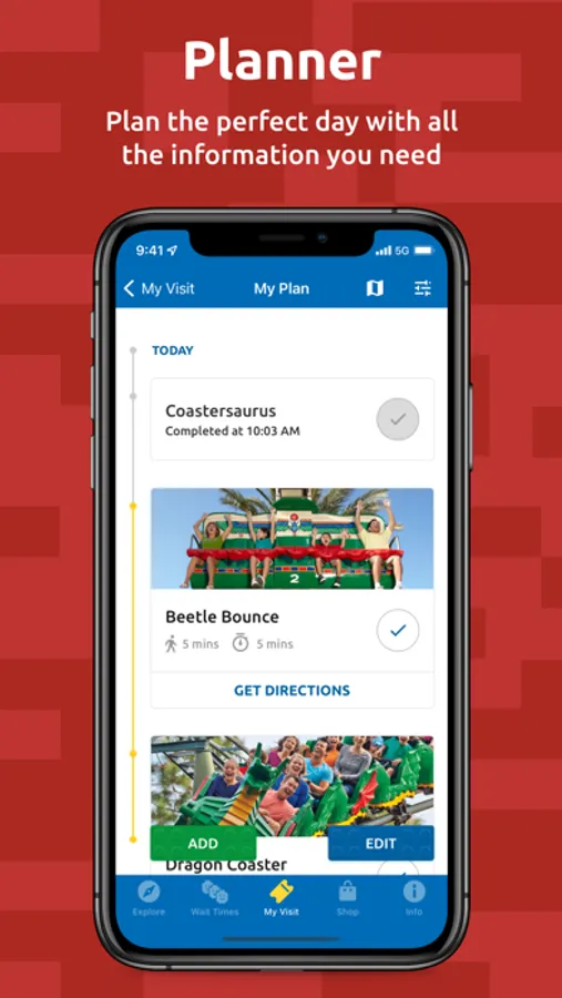 • Use our Planner tool to get all the information you need for your visit before you’ve even arrived. Tell the app who is in your party to see which rides are suitable for everyone. Then add your favourites and check them off as you go!