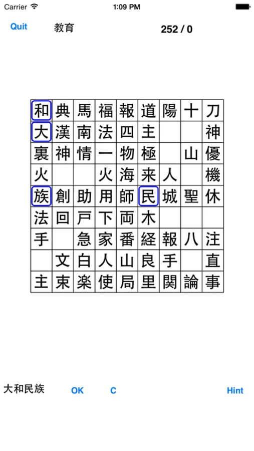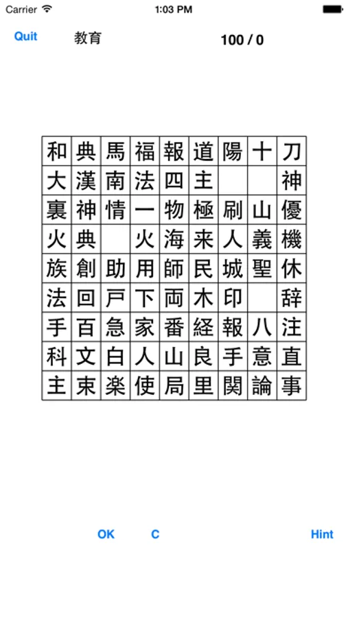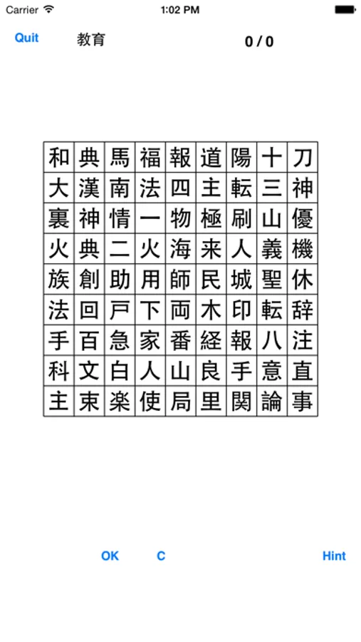 シャッフルされた日本語の漢字の中から二字・三字・四字熟語を探してタッチしながら文字を消してゆくゲームです