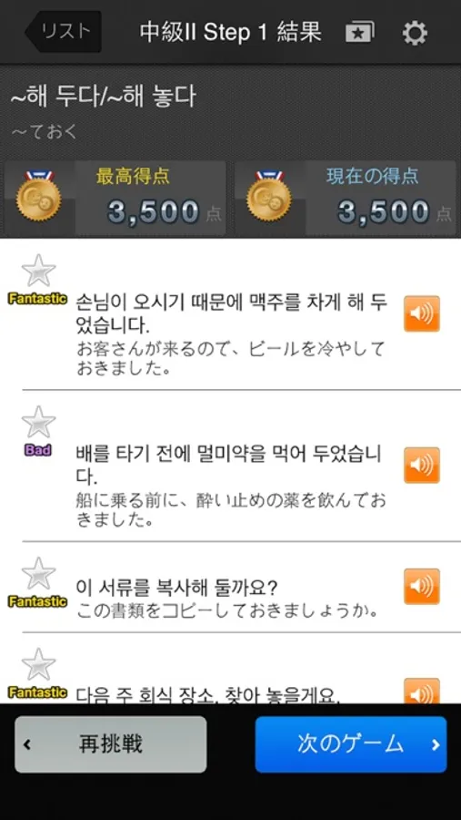 【5】結果画面では出題された韓国語文の音声を個別に聞くことができます。