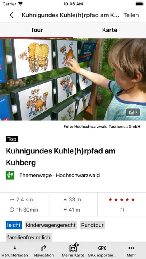 - zu jeder Tour: Länge, Dauer, Schwierigkeit, Höhenprofil, Bilder, Anfahrt und Parkmöglichkeiten