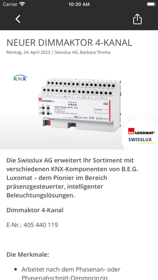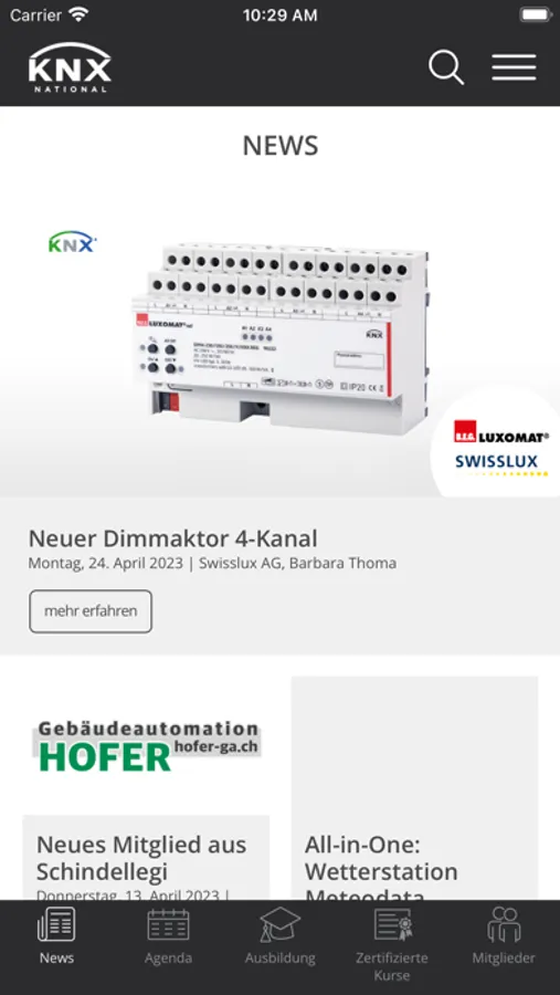 Die offizielle App der KNX Swiss basiert auf der Struktur der Website www.knx.ch und enthält die Rubriken: News, Magazin, Agenda, Kurse, KNX Partner und Jobs sowie Projekte.