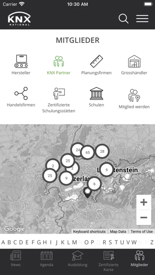 Unter Kurse sind sowohl Herstellerkurse als auch die zertifizierten KNX-Ausbildungen abrufbar. Sie können nach Datum und Anbieter geordnet werden. Im Menü Partner sind alle KNX Partner wie, Hersteller, Grosshändler und Planungsfirmen aufgeführt, die mit KNX Produkten arbeiten. Dazu kommen die Schulen und Schulungsstätten, die KNX Anwender ausbilden. Die Angaben können nach Namen, PLZ oder Ort geordnet, Kontakte können zudem zum eigenen Adressbuch hinzugefügt werden. Die Standorte der Partner werden auf einer Karte angezeigt und die Interessenten können die KNX Partner auch nach GPS-Daten suchen.