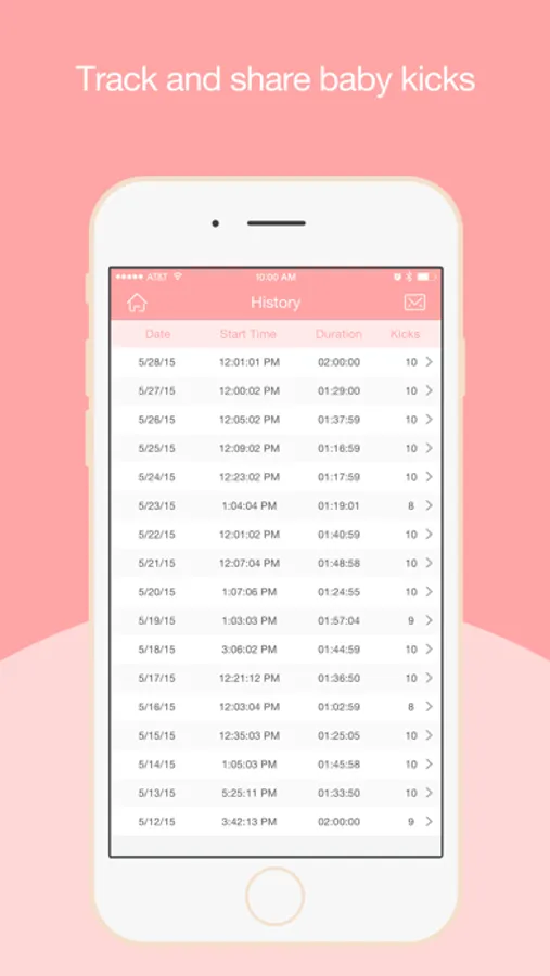 Baby Kicks Monitor will record the date, start date, duration and times of kicks of each test. When the kicking reaches 10 times or the time reaches 2 hours, the kick session will stop automatically. If you wish to redo the test or end the test, you can press the X button in the upper-right corner to stop it.