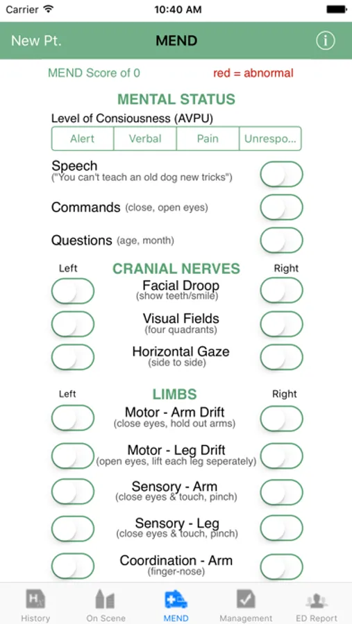 The MEND EMS application facilitates the organization of detection and management of the stroke patient in the Prehospital setting. The application is divided into tabs that allow the user to navigate in order from the History to the CPSS, the MEND exam, management considerations and references and ED report. The user is initially prompted to choose whether this is a new patient or to resume the information on the current patient.