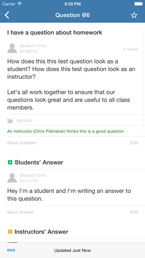 Piazza is the leading social learning platform for higher education, used by hundreds of thousands of students and more than 15 thousand professors for centralized class communications and polling. If you're a student, the Piazza app lets you ask and answer questions in all your Piazza classes from your mobile device, and updates you in real time when your peers are engaged. If you're an instructor, the app gives you a simple way to check in on your students during those spare moments between meetings. Stay connected to your class with Piazza!