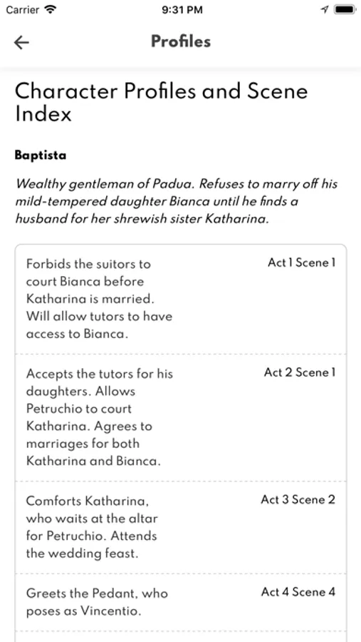 Profiles of every character with scene index.
