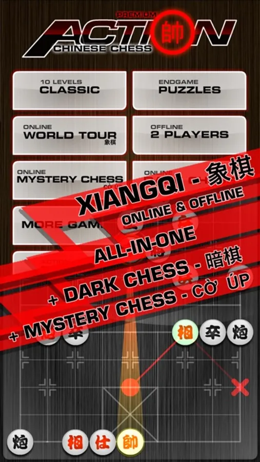 Action Chinese Chess is the best Chinese Chess board game, aka Co Tuong (Cờ Tướng) or Xiangqi (象棋) in the market with amazing graphics, smart computer, and awesome features.