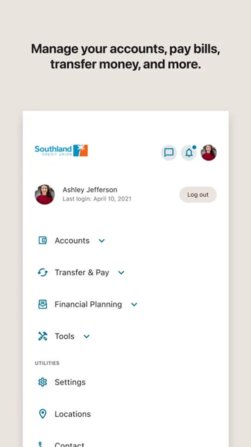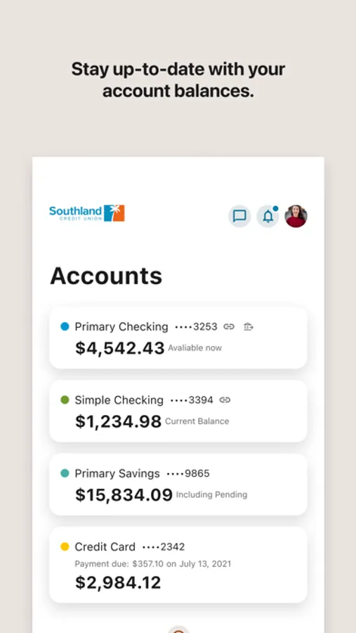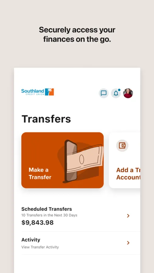 Southland CU Mobile App allows you to check balances, deposit checks, view transaction history, transfer funds, and pay bills on the go!