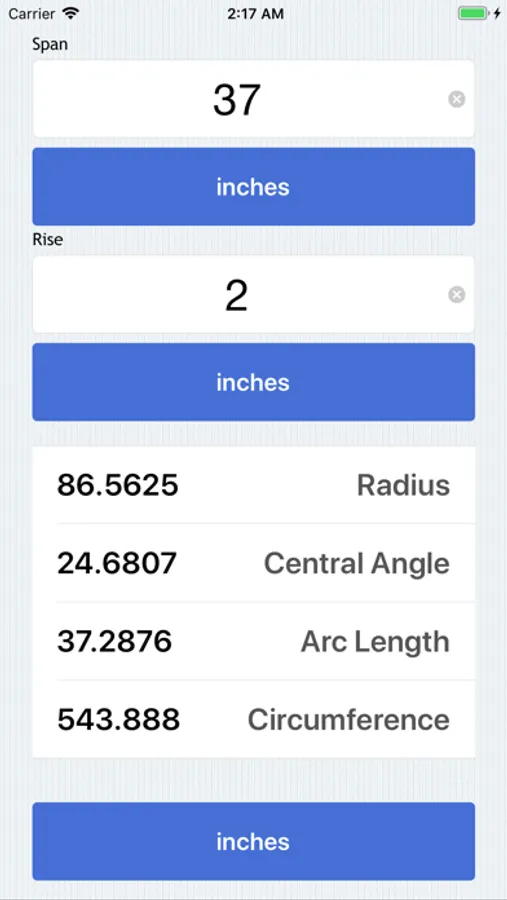 Designed for the multiple trades in the construction industry, this calculator is great for any craftsman who needs to find properties of a circle given curve measurements. In particular, Radius Calculator is perfect carpenters or cabinet makers who deal with curved walls.