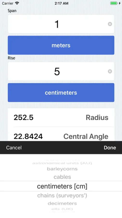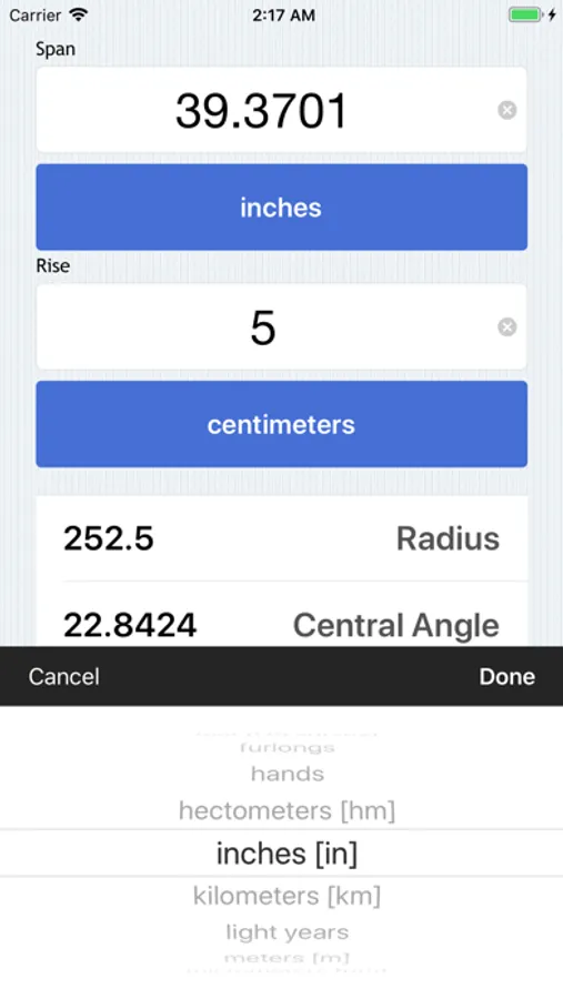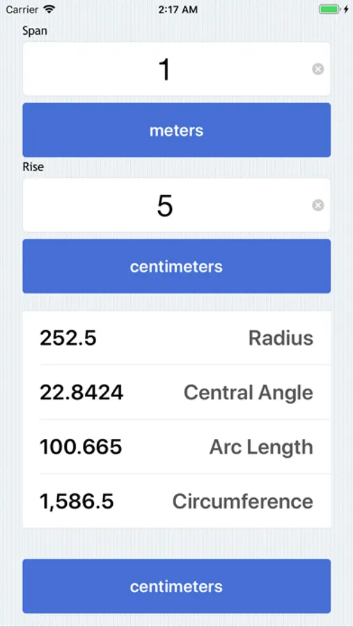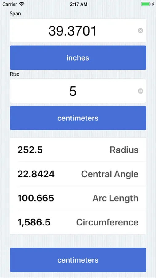 Radius Calculator allows you to calculate the radius, central angle, arc length, and circumference from the span / chord and rise of an arc segment. Built-in unit converter makes it to work with any length unit (including inches, feet, centimeters, meters, and many more).