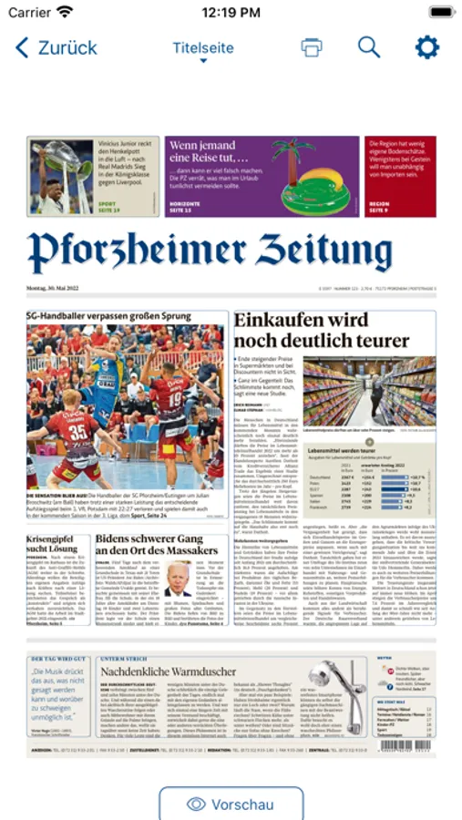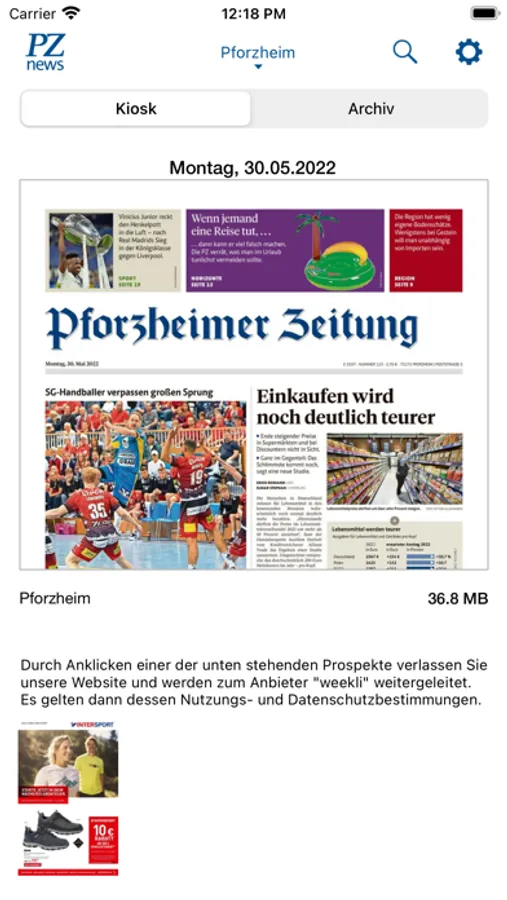 Über das Zeitungs-Icon in der oberen Ecke der App kommen Sie zur E-Paper-Ausgabe der „Pforzheimer Zeitung“. Hier können Sie als Digital-Abonnent nicht nur die aktuelle Ausgabe mit hoher Nutzerfreundlichkeit lesen. Ab 21 Uhr erhalten Sie auch die Abendausgabe der Zeitung. Sie können sich die Artikel im E-Paper auch durch eine Audiofunktion vorlesen lassen. Es stehen alle drei Ausgaben der PZ zum Download bereit: Hauptausgabe Pforzheim, Mühlacker und Nordschwarzwald. Ein ganz besonderer Schatz ist unser digitales Zeitungsarchiv, das sich ebenfalls in der App befindet. Hier können Sie durch Ausgaben stöbern, die seit der ersten PZ vom 1. Oktober 1949 erschienen sind. Im E-Paper lassen sich auch sämtliche Beilagen der Zeitung sowie das Fernsehprogramm rtv und das Lifestyle-Magazin „Land&Leute“ herunterladen.