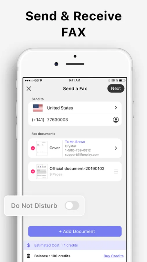 - In-App Fax: Send and receive faxes when you are out of the office or have no fax machine at all. Fax over 100 countries (cost calculated by the number of pages and recipient country and paid via in-app purchase). Receive a push notification to remind you of a fax status change: sent or received successfully or failed to deliver