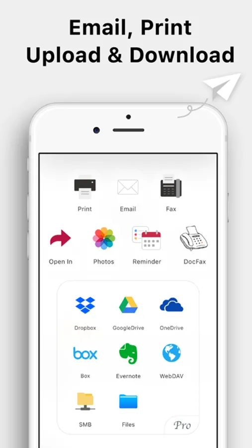 - Support upload to iCloud Drive, Dropbox, Evernote, Box, OneDrive, Google Drive with OCR (Optical Character Recognition) option, SMB (Win / Mac), and WebDAV