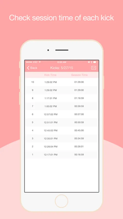 Baby Kicks Monitor will record the date, start date, duration and times of kicks of each test. When the kicking reaches 10 times or the time reaches 2 hours, the kick session will stop automatically. If you wish to redo the test or end the test, you can press the X button in the upper-right corner to stop it.