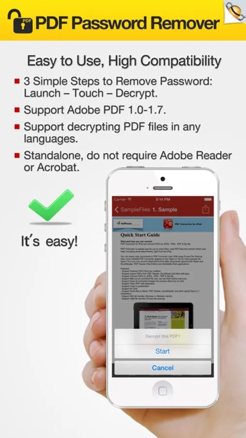Remove PDF password and restrictions with just 3 simple steps: Launch – Touch – Decrypt
