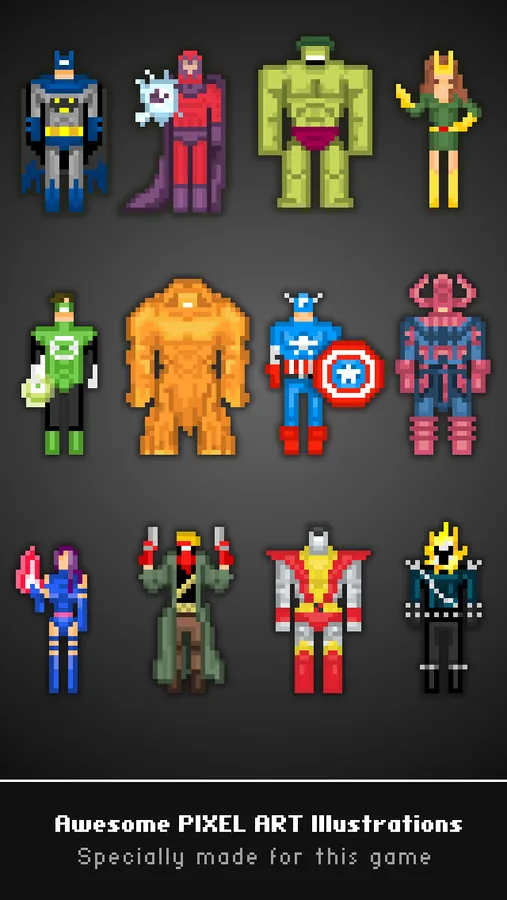 PixelWorld #1 Comics! is a retro pixel art quiz game based on comic-book characters. How much do you know about comics? Can you recognize the heroes behind these sweet pixel art illustrations specially made for the app? If you get stucked don't forget to ask for help using the Instagram / Twitter buttons.
