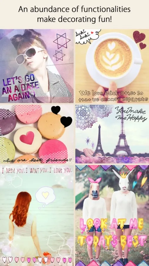 With this one app, you can enjoy a large variety of styles: PURIKURA style decoration, filter processing, one-shot photo decoration, photo collage, message card, blog photos.