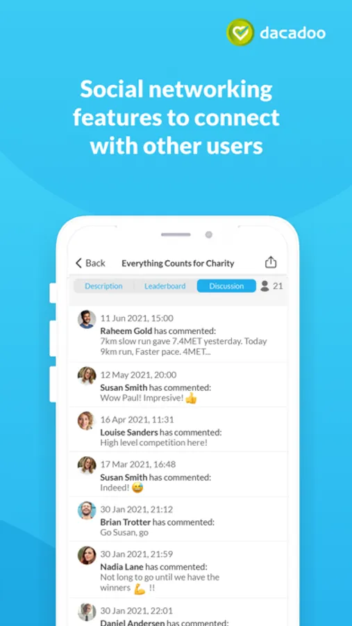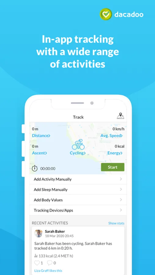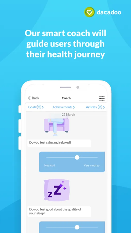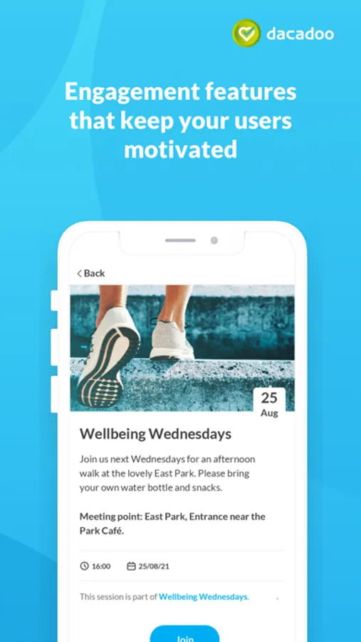 On dacadoo, users can closely monitor their exercise, nutrition, mindfulness and sleep, as well as their physical and mental wellbeing. Besides the integrated tracking functionality, users can also take advantage of popular apps and devices, such as Apple Health to help synchronize exercise, weight, sleep and other data with dacadoo. To help your users remain active and engaged, dacadoo applies motivation techniques from behavioral science and gamification, collaborative features from social networks, and provides personalized feedback.