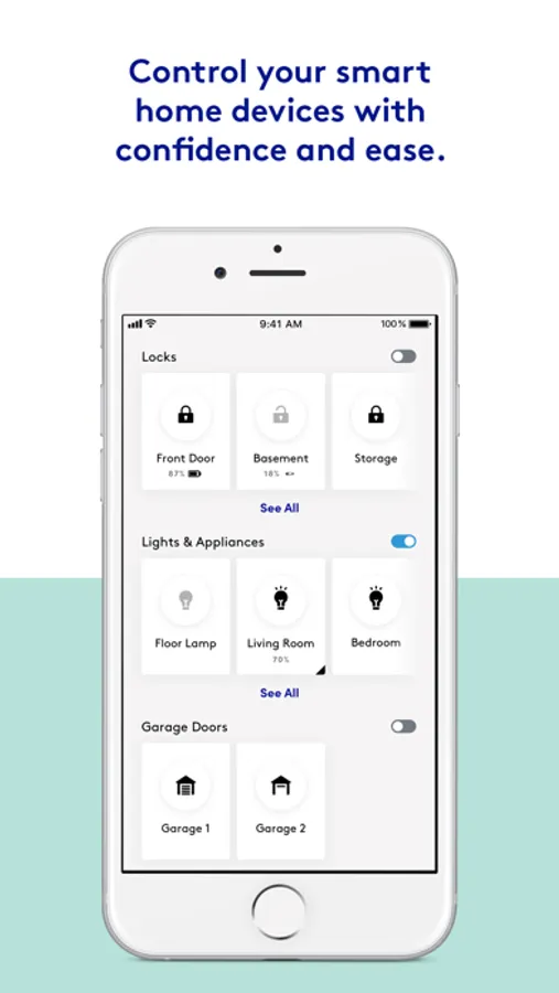 - Turn on and off the lights, lock/unlock the door, adjust the thermostat, and open/close your garage door with your security system