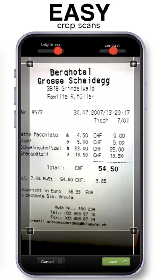 Scan Receipts App automatically detect document edges and corners and sort all your scans by date and categories for fastest access anytime anywhere.