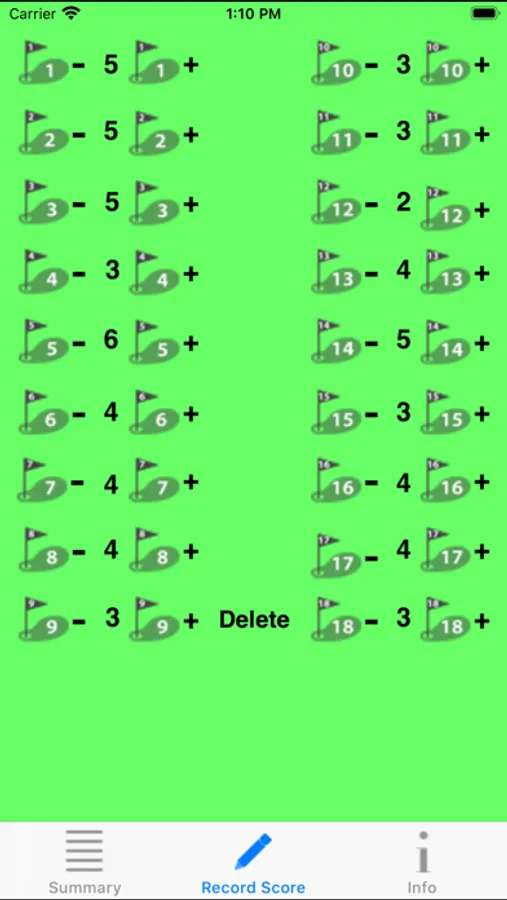 The app combines features of a manual clicker with that of a score card, except you don't have to write or calculate your score. All you need to do is tap a button on the "Record Score" screen as you play. This advances the score and if you made a mistake you tap another button to subtract a score. There is no limit to the number of strokes that can be entered.