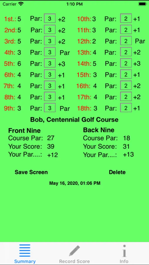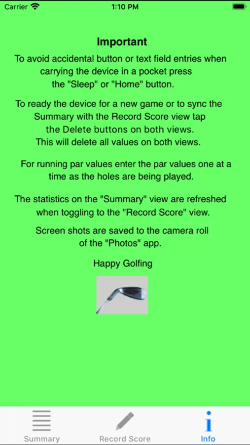 A permanent record of the game, including the golf course name and an automatic time/date stamp, can be saved as a screen shot of the "Summary" page from within the app. The screen shot is saved to the Camera Roll of the "Photos" app from where it can be e-mailed.