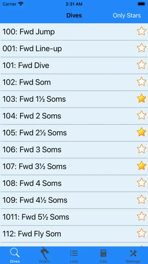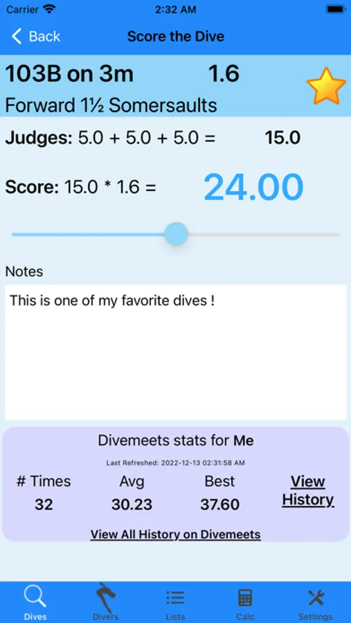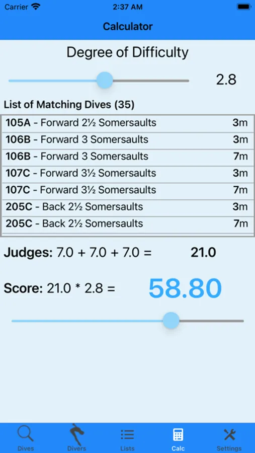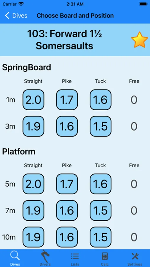 Dive List provides all the information from the FINA Degree of Difficulty Tables (effective as of 2017) in an easy to use interface. Use it to help craft a dive list for yourself or your diver(s). It also contains a quick score calculator you can use to determine the score of a given dive based on sample judges scores. Mark some of the dives as favorites for quick access.
