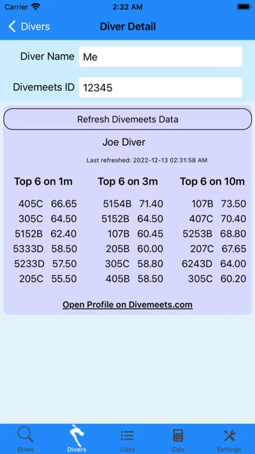 Show information from divemeets.com to see a dive's history, or to view your own profile.