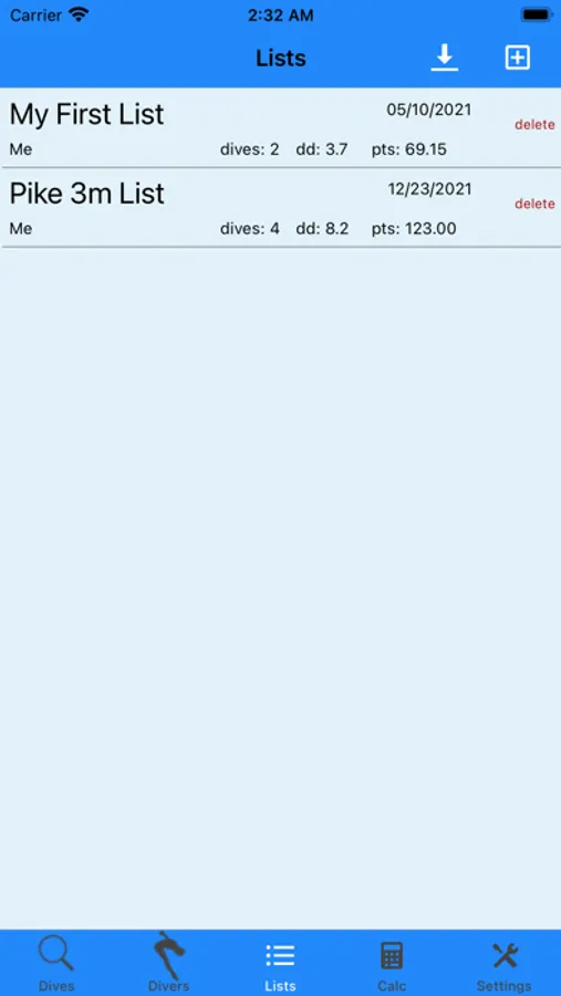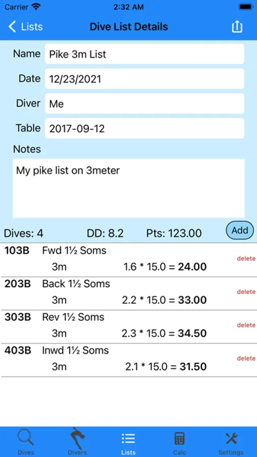 Dive List Pro - an in-app purchase allows for tracking multiple lists of dives. Use it to keep track of your 1-meter, 3-meter, and platform lists, as well as Summer League, Junior and Senior USA Diving. Document the score of a given list for history. You can even track lists for multiple divers for your friends on the team, or the athletes you are coaching.
