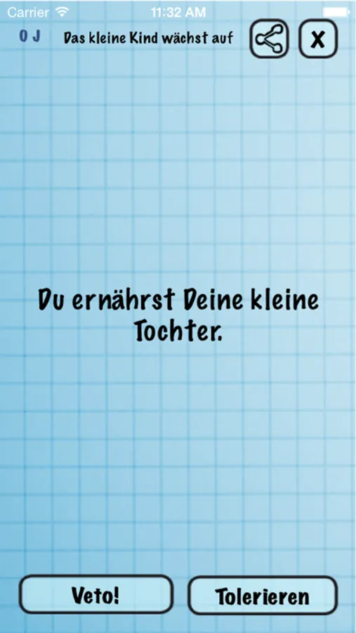 Sie schicken ein Kind auf den Lebensweg, den Sie selbst durch Ihr erzieherisches Eingreifen entscheidend beeinflussen können. Sie können jeweils eingreifen, indem Sie einen Entwicklungsschritt des Kindes unterbinden: Sobald Sie dem Kind Ihre Unterstützung entziehen, eine Handlung verbieten oder zumindest mal ein ganz ernsthaftes Wort mit Sohn/Tochter reden möchten, sollen Sie dies mit einem "Veto!" kundtun.