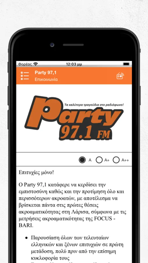 The navigation options for the user are 2. First of all, live streaming, so that you can listen to your favorite station live from your iphone. Secondly, the contact information option for any issue you might want to share with us.
