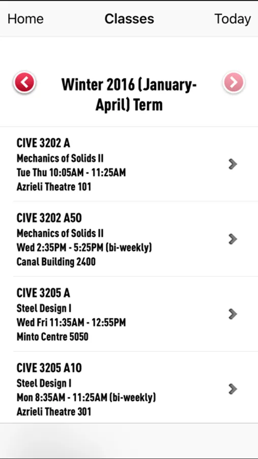 • Classes – view your personalized class schedule complete with the class time and mapped location. A weekly view of your class schedule is now available.