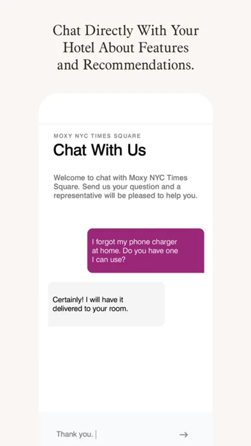 Mobile Chat lets you talk directly to your hotel. Available just before, during and even after your stay, ask the front desk for local recommendations, request amenities and more while on-the go.