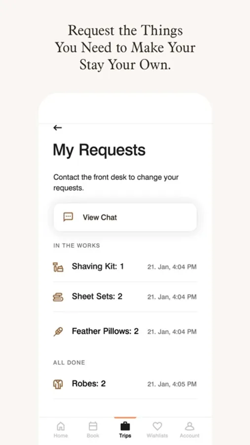 Need something? Mobile Requests gives you a list of amenities to choose from to customize your stay, or even ask for something you forgot, like a comb or toothpaste.