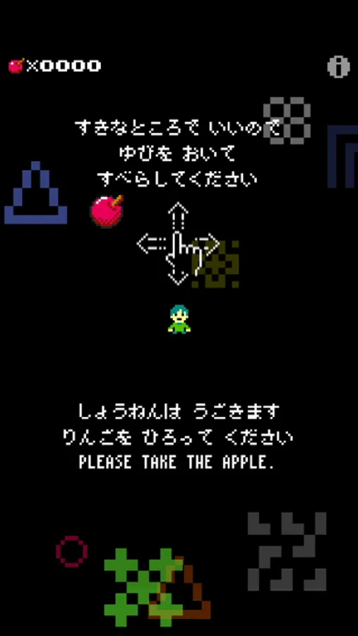 「Ringo」は敵も障害もクリア条件もない安全が保証されたスペースの中で少年を操作し、ただひたすらリンゴを拾い続けるアプリです。