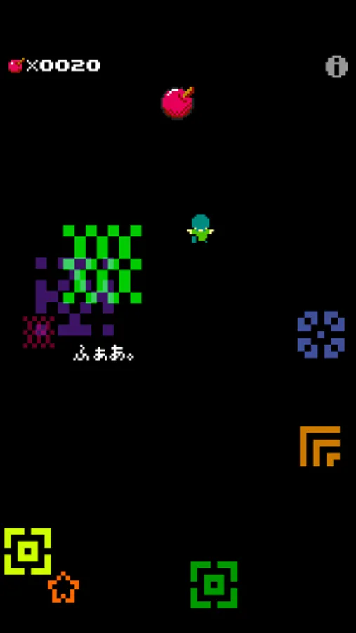 リンゴを拾う度にランダム生成されるドットマトリクスの色と形、500種類を超える言葉の変化、時折流れる様々なBGMが貴方の意識に程良い刺激を与えます。