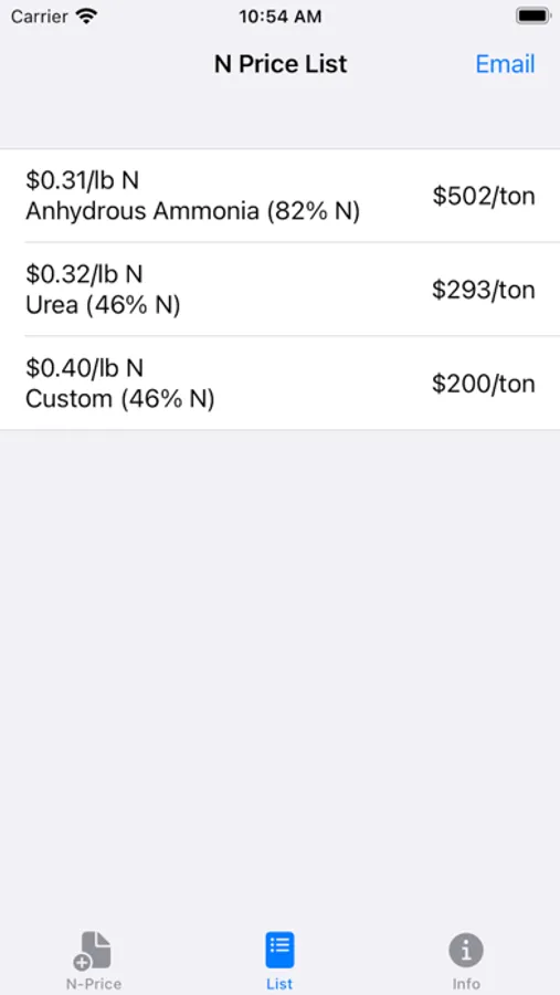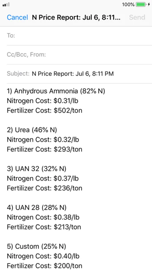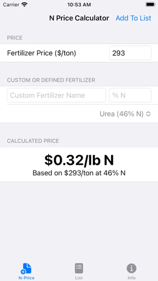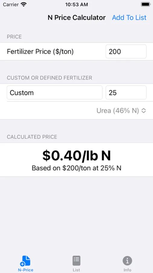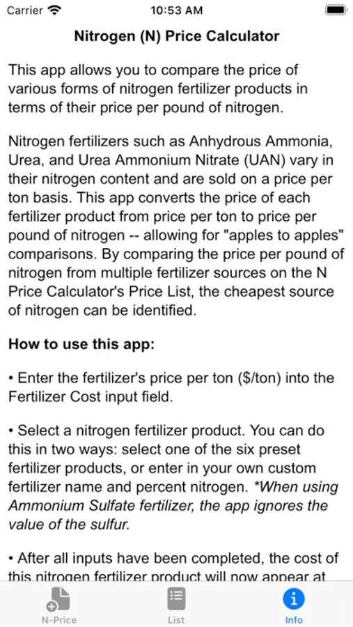 The app then lets you add the price to a list of prices on a separate screen. In this manner, you build a price list to compare. By comparing the price per pound of nitrogen from multiple fertilizer sources on the N Price Calculator's Price List, the cheapest source of nitrogen can be identified.